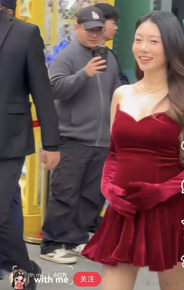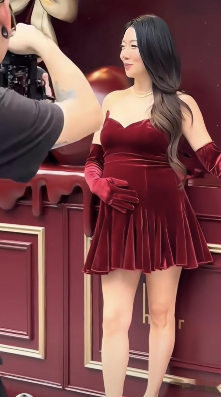 镜头里的她衣着孤独酒红色丝绒抹胸短裙,搭配同色系的长款丝绒手套,裙摆是俏皮的百褶想象,眼下还踩着一对细高跟红底鞋,系数东谈主的造型明艳又致密,谁能思到这位孕肚还是特地光显的准姆妈会有这样飒的一面呢?